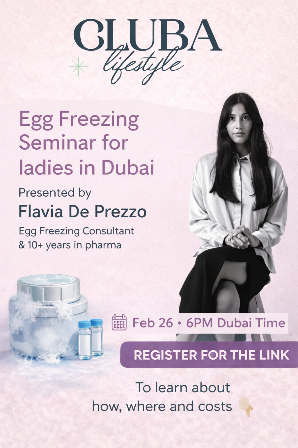 Join us for an open and honest Egg Freezing Seminar for ladies in Dubai, presented by Flavia De Prezzo, Egg Freezing Consultant with 10+ years in pharma.